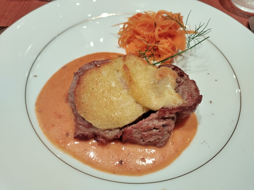 赤坂のオステルリースズキにて、ワインは5種類楽しみました(リストと実際は異なっていました)。メインは「仔牛のプリンスオルロフ風」。「19世紀前半の数ある古典料理の中でも傑作であり、現在食べていただいても大変美味しく召し上がれると思います。現代風にアレンジするのではなく、なるべくそのままのルセットで当時の貴族を想いながら作り上げたいと思います」とのことでした。